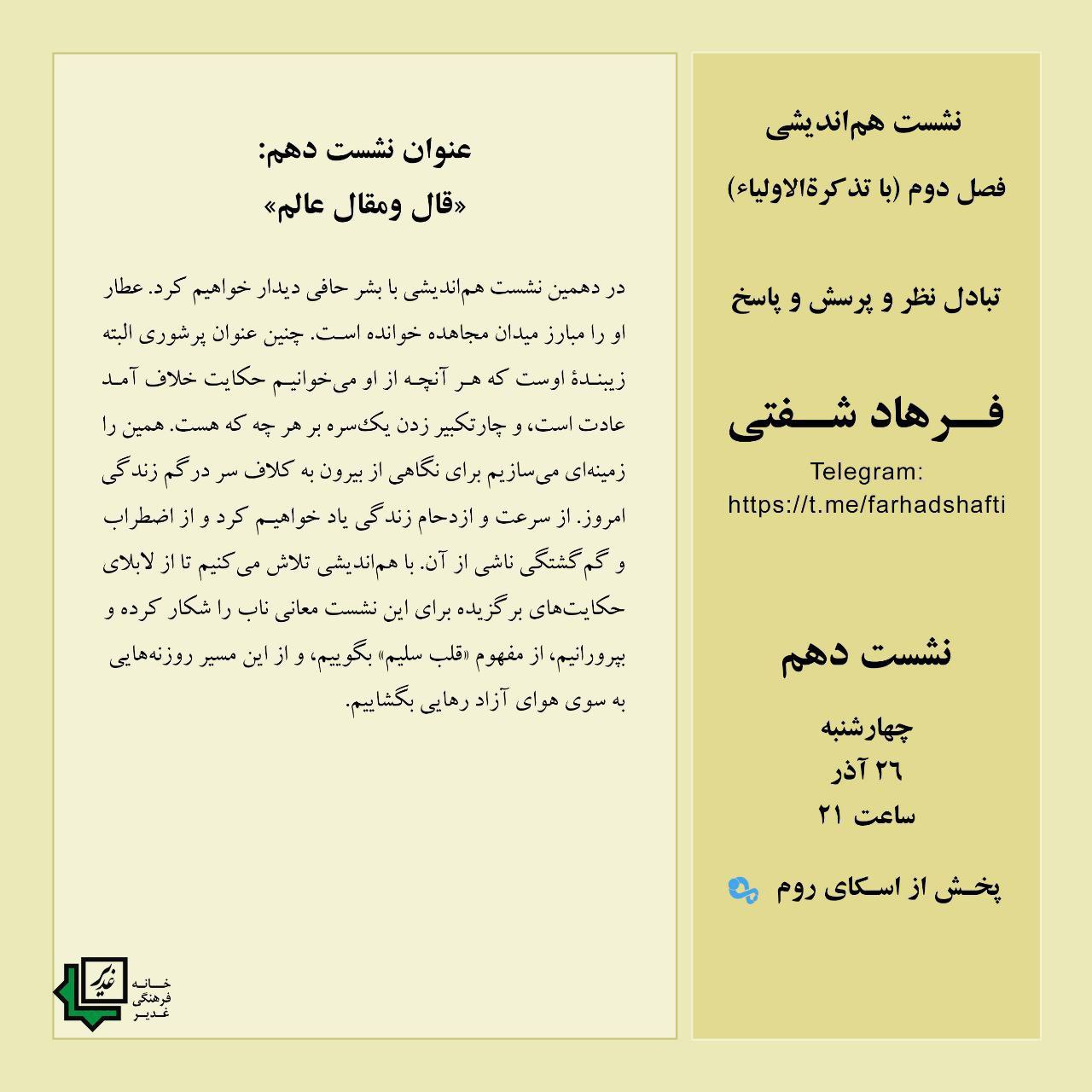 در دهمین نشست هماندیشی با بشر حافی دیدار خواهیم کرد. عطار او را مبارز میدان مجاهده خوانده است. چنین عنوان پرشوری البته زیبندهٔ اوست که هر آنچه از او میخوانیم حکایت خلاف آمد عادت است، و چارتکبیر زدن یکسره بر هر چه که هست. همین را زمینهای میسازیم برای نگاهی از بیرون به کلاف سر در گم زندگی امروز. از سرعت و ازدحام زندگی یاد خواهیم کرد و از اضطراب و گمگشتگی ناشی از آن. با هم اندیشی تلاش میکنیم تا از لابلای حکایتهای برگزیده برای این نشست معانی ناب را شکار کرده و بپرورانیم، از مفهوم «قلب سلیم» بگوییم، و از این مسیر روزنههایی به سوی هوای آزاد رهایی بگشاییم.
