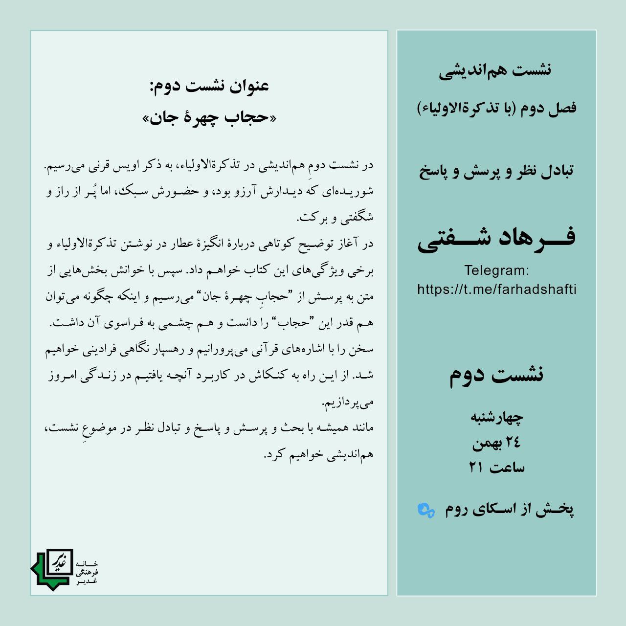 در آغاز توضیح کوتاهی دربارۀ انگیزۀ عطار در نوشتن تذکرةالاولیاء و برخی ویژگیهای این کتاب خواهم داد. سپس با خوانش بخشهایی از متن به پرسش از «حجابِ چهرۀ جان» میرسیم و اینکه چگونه میتوان هم قدر این «حجاب» را دانست و هم چشمی به فراسوی آن داشت. سخن را با اشارههای قرآنی میپرورانیم و رهسپار نگاهی فرادینی خواهیم شد. از این راه به کنکاش در کاربرد آنچه یافتیم در زندگی امروز میپردازیم.