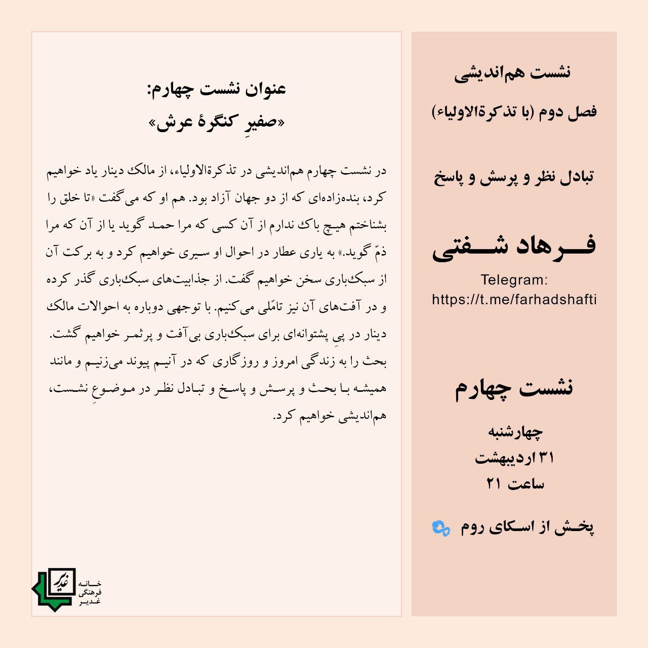 در نشست چهارم هماندیشی در تذکرةالاولیاء، از مالک دینار یاد خواهیم کرد، بندهزادهای که از دو جهان آزاد بود. هم او که میگفت «تا خلق را بشناختم هیچ باک ندارم از آن کسی که مرا حمد گوید یا از آن که مرا ذمّ گوید.» به یاری عطار در احوال او سیری خواهیم کرد و به برکت آن از سبکباری سخن خواهیم گفت. از جذابیتهای سبکباری گذر کرده و در آفتهای آن نیز تامّلی میکنیم. با توجهی دوباره به احوالات مالک دینار در پیِ پشتوانهای برای سبکباری بیآفت و پرثمر خواهیم گشت. بحث را به زندگی امروز و روزگاری که در آنیم پیوند میزنیم و مانند همیشه با بحث و پرسش و پاسخ و تبادل نظر در موضوعِ نشست، هماندیشی خواهیم کرد.