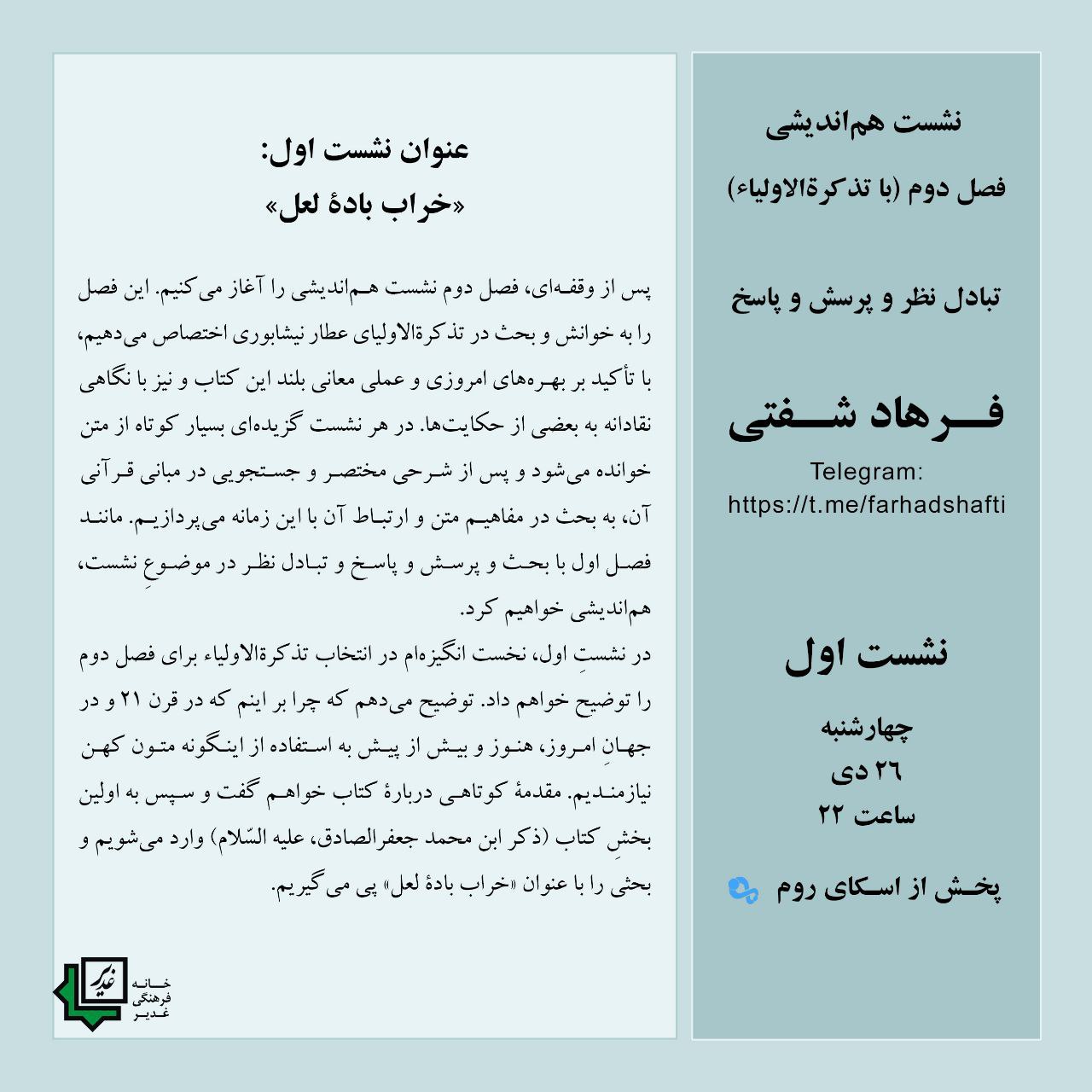 پس از وقفه‌ای، فصل دوم نشست هم‌اندیشی را آغاز می‌کنیم. این فصل را به خوانش و بحث در تذکرةالاولیای عطار نیشابوری اختصاص می‌دهیم، با تاکید بر بهره‌های امروزی و عملی معانی بلند این کتاب و نیز با نگاهی نقادانه به بعضی از حکایت‌ها. در هر نشست گزیده‌ای بسیار کوتاه از متن خوانده می‌شود و پس از شرحی مختصر و جستجویی در مبانی قرآنی آن، به بحث در مفاهیم متن و ارتباط آن با این زمانه می‌پردازیم. مانند فصل اول با بحث و پرسش و پاسخ و تبادل نظر در موضوعِ نشست، هم‌اندیشی خواهیم کرد.