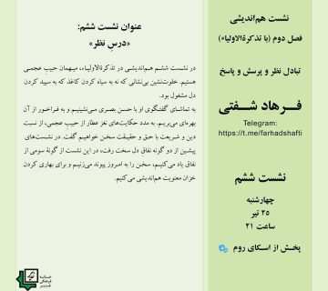عنوان نشست هفتم: « طبیبِ عشق»Adminalborzشهریور ۲۶, ۱۴۰۴در نشست هفتم هماندیشی، تنها روایت تذکرةالاولیاء از یک عارف زن را پیش رو خواهیم گذاشت: رابعه عدویه، همان که ... ادامه مطلب