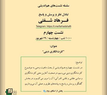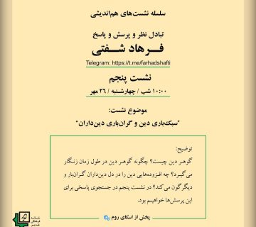 سلسله نشستهای هماندیشی ۱Adminalborzآذر ۱۲, ۱۴۰۲تبادل نظر و پرسش و پاسخ فرهاد شفتی نشست چهارم: 10:00 شب، چهارشنبه :29 شهریور موضوع سخن آغازین در این نشست:«کثرت انگاری دینی» ... ادامه مطلب