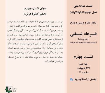 عنوان نشست چهارم: «صفیرِ کنگرۀ عرش»Adminalborzاردیبهشت ۳۱, ۱۴۰۴در نشست چهارم هماندیشی در تذکرةالاولیاء، از مالک دینار یاد خواهیم کرد، بندهزادهای که از دو جهان آزاد بود. هم ... ادامه مطلب