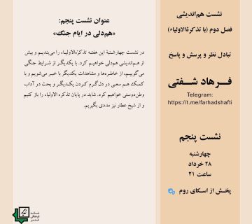 عنوان نشست پنجم: همدلی در ایام جنگAdminalborzخرداد ۲۸, ۱۴۰۴در نشست چهارشنبۀ این هفته تذکرةالاولیاء را میبندیم و بیش از هماندیشی همدلی خواهیم کرد. با یکدیگر از شرایط جنگی ... ادامه مطلب